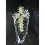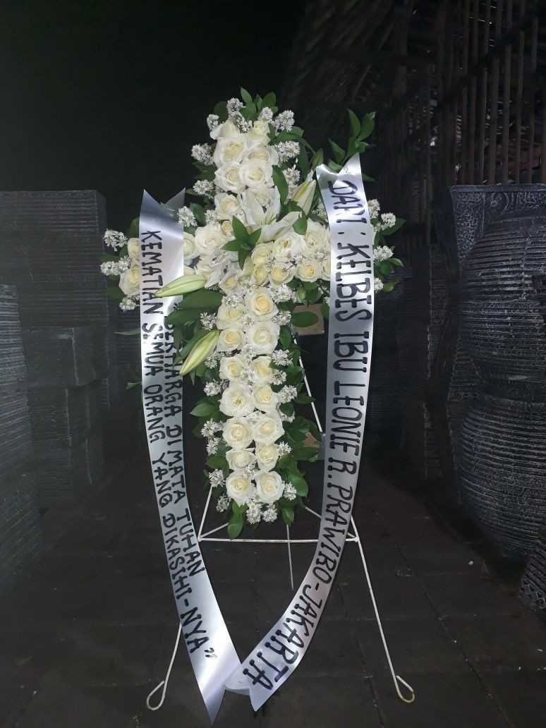 Bunga Standing Dukacita bentuk salib untuk ucapan turut berdukacita atau berbela sungkawa, terdiri dari full bunga mawar plus kasablanka, standing dari besi.